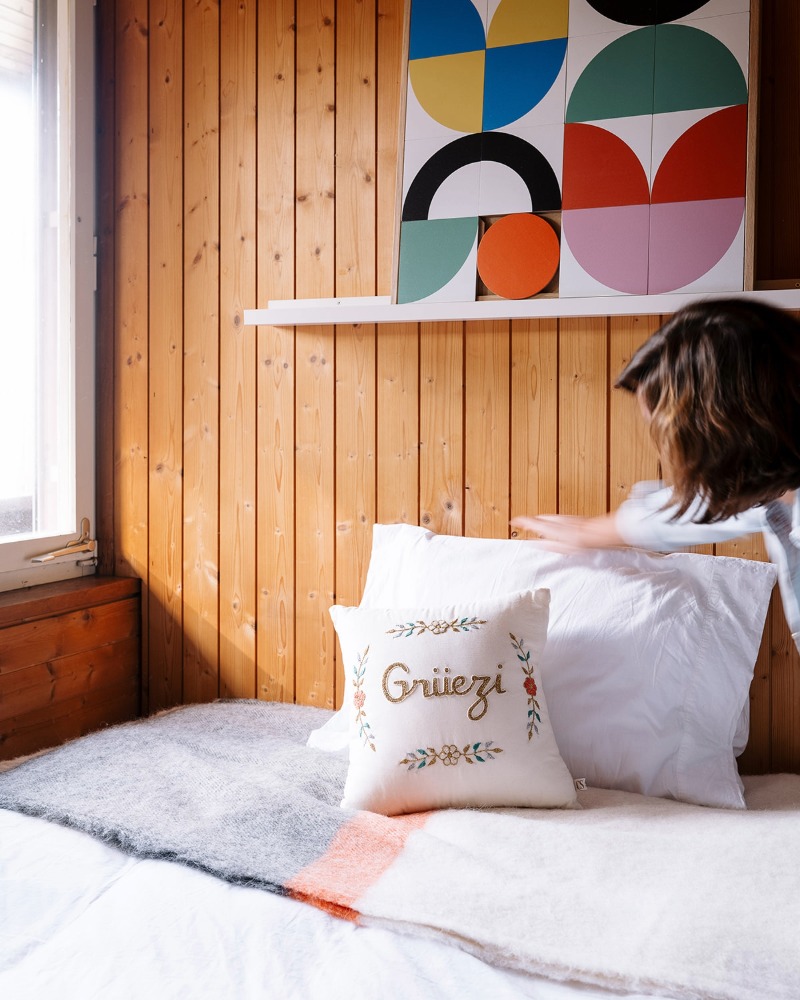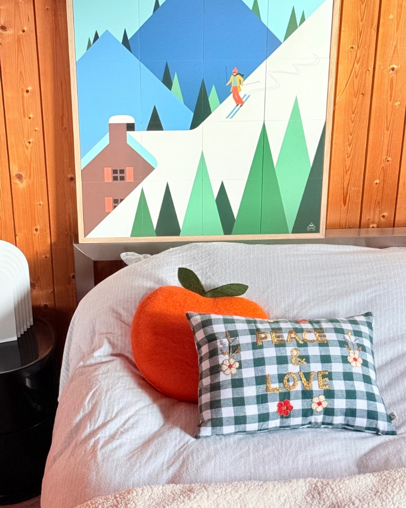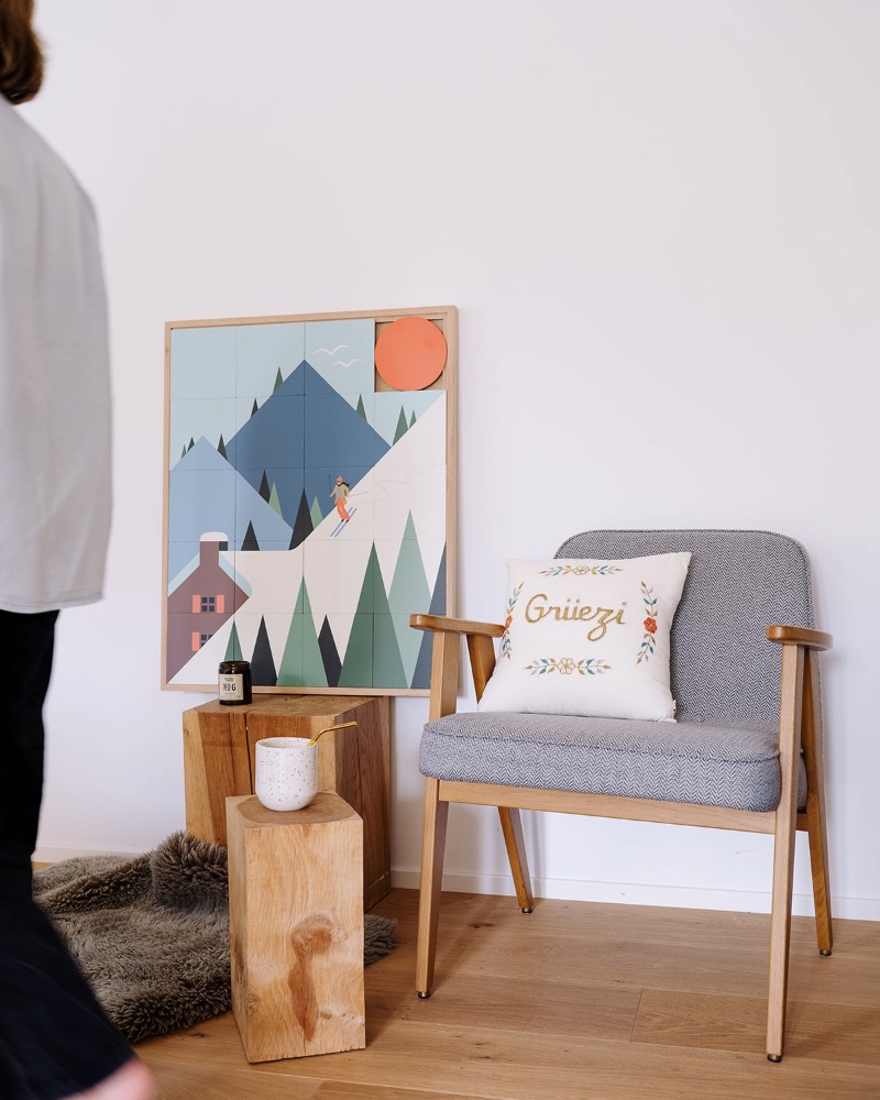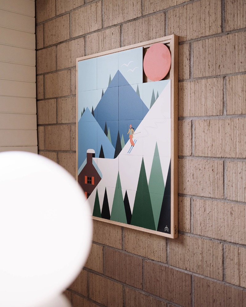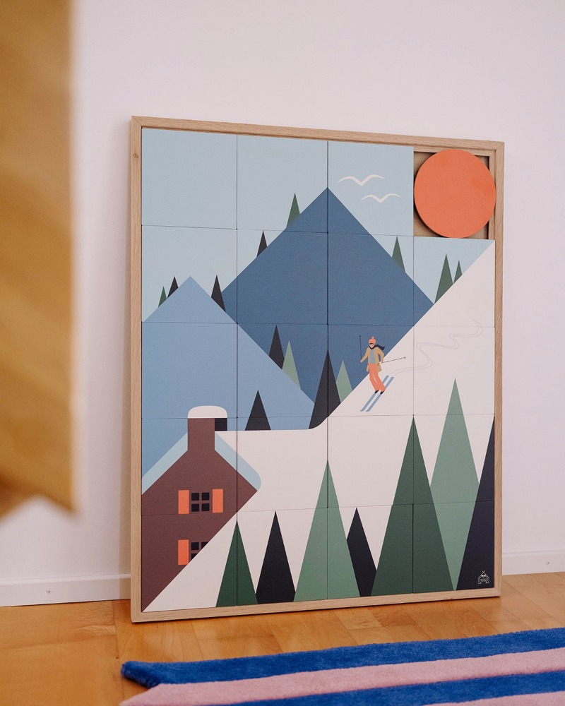 The Taquin “Schuss” wooden wall art, designed in partnership with Les Petits Yéyés, transports us into a colourful, graphic and slightly vintage alpine world.
