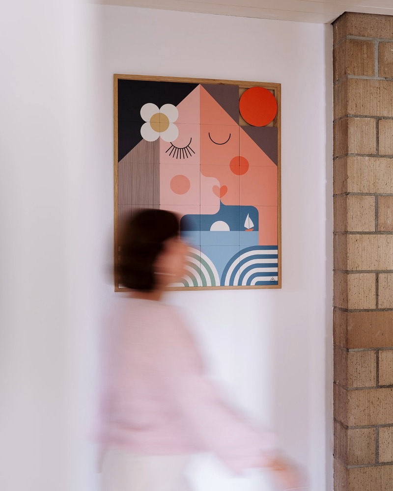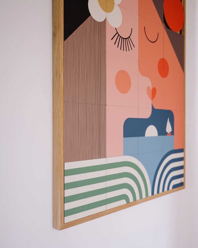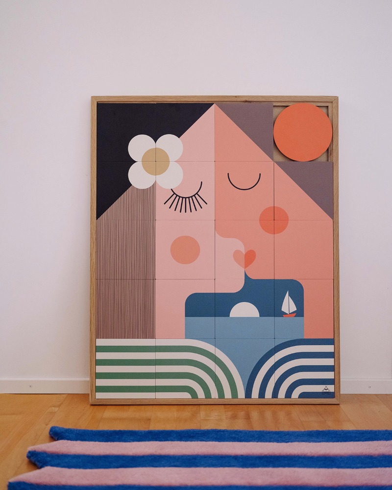The image tells a story. Rearrange the tiles and it tells a different one. A summer encounter becomes an abstract. A feeling becomes a colour field. Et Boom is one of the most emotionally expressive pieces in the Taquin collection — and one of the most surprising to play with.