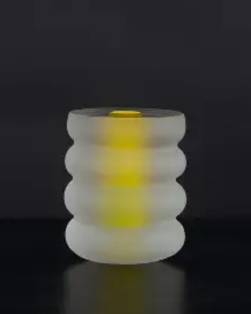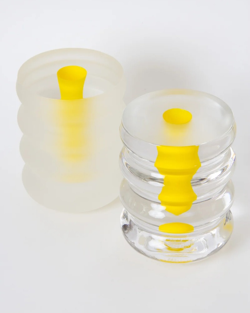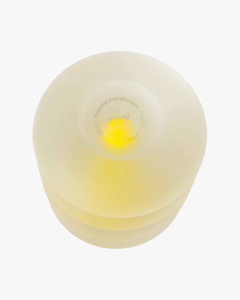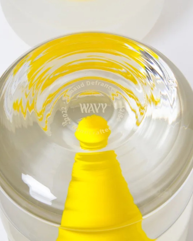 The Wavy Vase in yellow is a contemporary glass vase born from Renaud Defrancesco’s research on the refraction of glass. By intentionally deforming the outer surface, the designer creates a subtle optical illusion : the inner cylinder appears visually larger than it actually is.