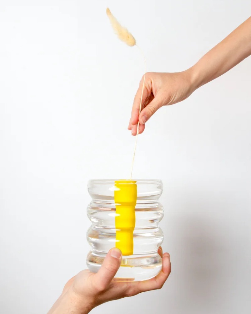 Its vibrant yellow color adds warmth and energy to mondern interiors. Whether displayed as a sculptural object or used with fresh or dried flowers, this designer vase becomes a true statement piece.